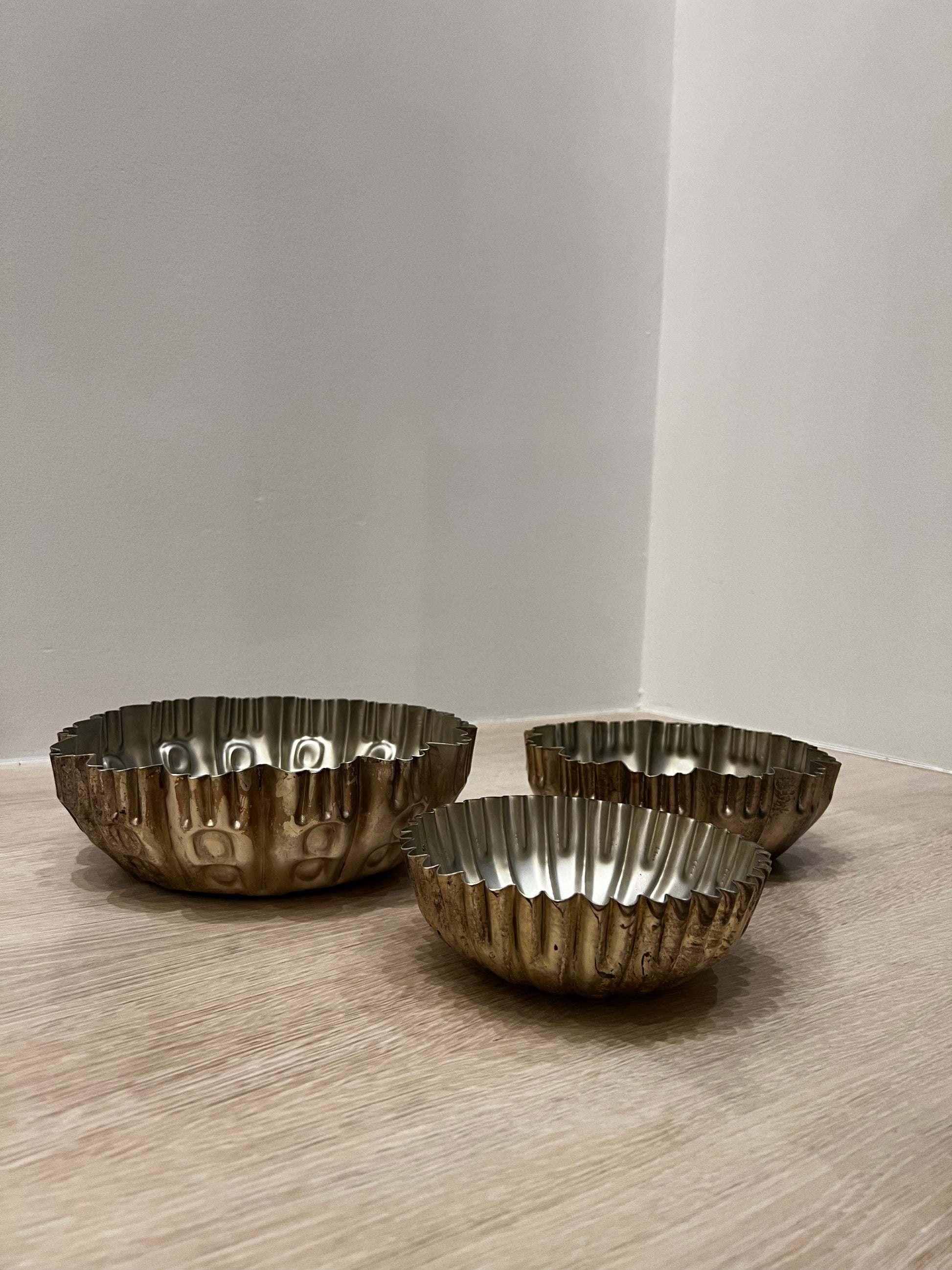 A medium antique metal bowl, perfect for displaying décor, serving, or adding a vintage touch to any space.